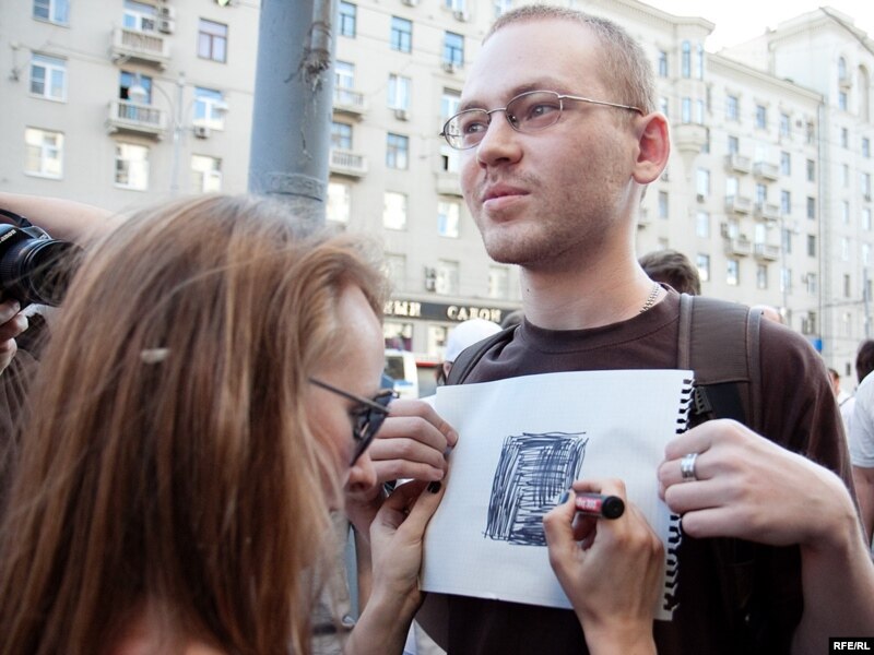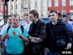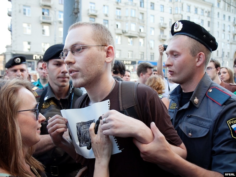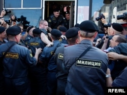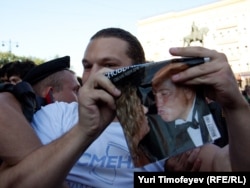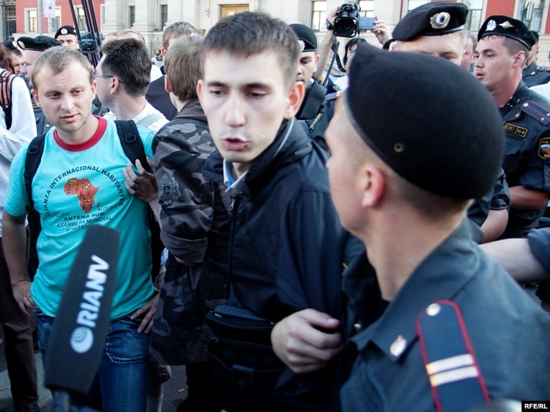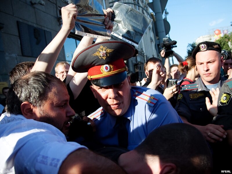 Как только Сергей Удальцов и его соратники достали "черные метки" для Юрия Лужкова, сотрудники милиции приступили к задержанию.
