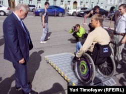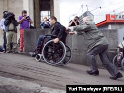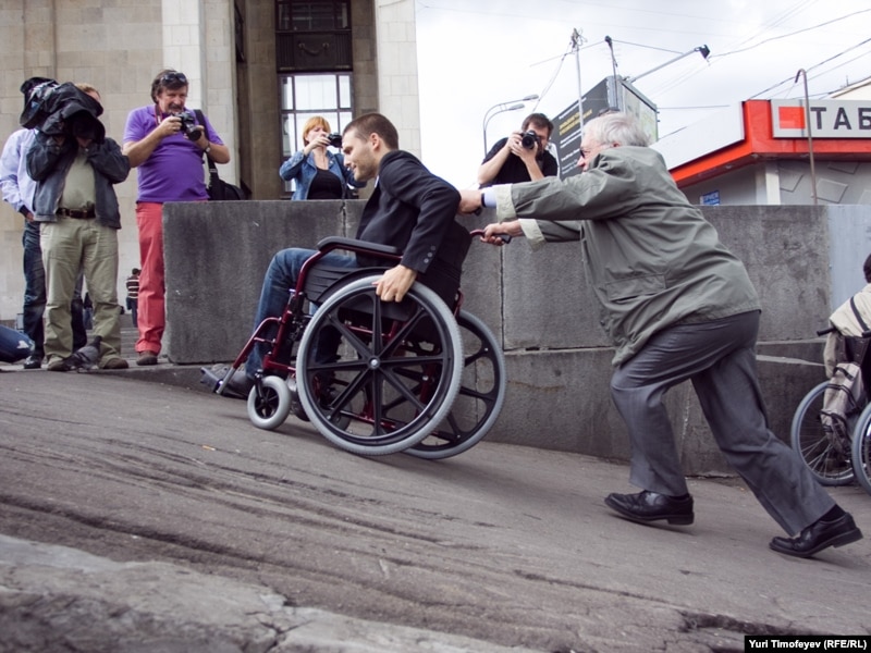 Уполномоченный по правам человека в России Владимир Лукин помогает участнику акции подняться по пандусу к Российской государственной библиотеке.