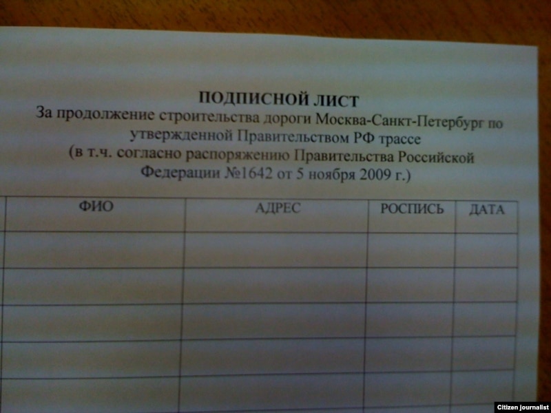 Потом мы получили абсолютно достоверную информацию, что старших по домам, в частности, в микрорайоне Левобережный города Химки, вызвали в местную территориальную администрацию (в каждом районе есть своя администрация, помимо общехимкинской) и дали текст того же обращения плюс бланки подписей – за сохранение существующего маршрута трассы через лес. Старших по домам попросили собрать подписи среди жителей микрорайона под этим обращением.