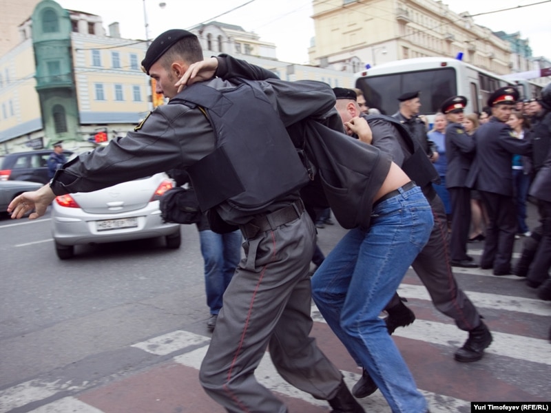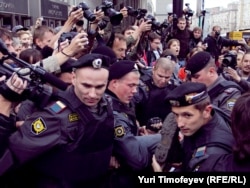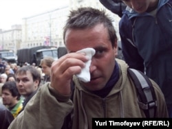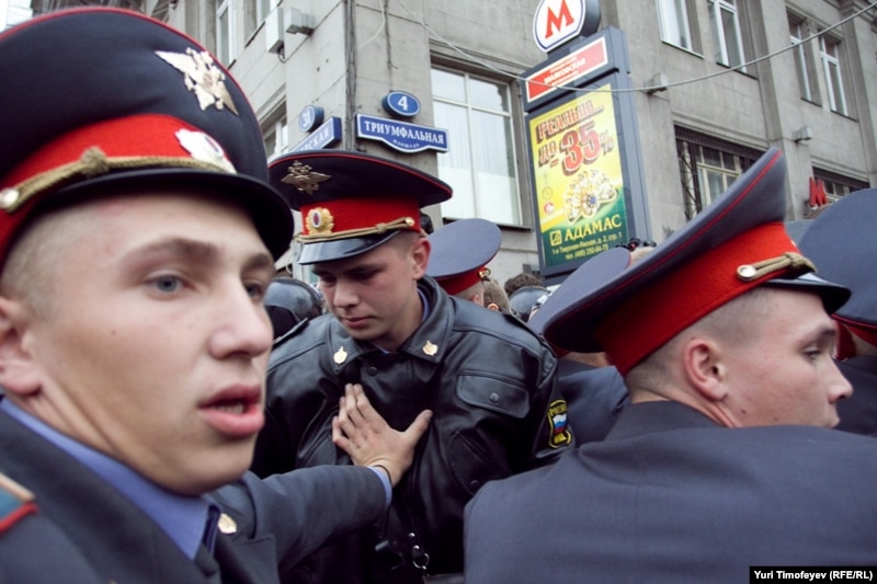 Главный редактор радиостанции "Эхо Москвы" Алексей Венедиктов объясняет милиционеру, что он просто стоит