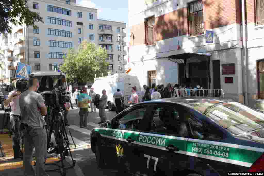 Утро 8 августа у Хамовнического суда. Не все журналисты попадут внутрь