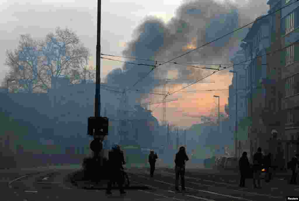 Дым над Франкфуртом-на-Майне 18 марта 2015 года от возгораний, устроенных демонстрантами