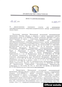 "Ночные волки", как следует из постановления, в ответ обязуются на 1 процента выделенной им территории построить торговую инфраструктуру, гостиницы, предприятия общественного питания, поля для гольфа, оборудовать маршруты для конных прогулок. Как сообщил сайту "Крым 24" и. о. директора департамента архитектуры и градостроительства Севастополя Алексей Брусенцев, постановление принято "на основании заявления "Ночных волков". По словам Брусинцева, на выделенной территории планируется создать развлекательно-познавательный парк и рекреационную зону. Ранее этот земельный участок принадлежал украинскому бизнесмену Вадиму Новинскому. Мероприятия "Ночных волков" проводятся здесь с 2007 года. Новинский утверждает, что договор аренды с байк-клубом истек в 2014 году, после чего принадлежащая ему земля была фактически захвачена.