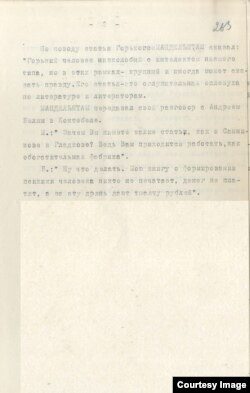 Здесь же – письмо Бухарина Сталину, написанное после ареста Мандельштама в 1934 году из-за стихотворения "Горец". Бухарин ценил Мандельштама и покровительствовал ему; Осип Эмильевич неоднократно обращался к Бухарину за помощью. Тогда произошло чудо: Мандельштама не расстреляли, но сослали в Чардынь.