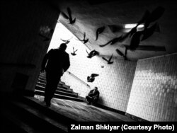 Сгорбленный человек, словно улитка, тащится к сияющему уличному фонарю… В подземном переходе прохожий распугивает стаю голубей… Старик курит, и его лицо скрывает клуб дыма… Эти мимолетные происшествия запечатлел на своих снимках московский фотограф Залман Шкляр, уже больше двадцати лет занимающийся уличной ("стрит") фотографией. Подписчики его инстаграма и других аккаунтов в социальных сетях могут познакомиться с цветными фотографиями Шкляра, а в Праге, в галерее Zahradnik, открылась выставка черно-белых работ "Симфония улиц". Разговор с фотографом записан на вернисаже.