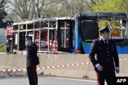 В Италии водитель автобуса с детьми протаранил на нём несколько полицейских машин, а затем поджёг его. Всего в этот момент в автобусе находились более 50 школьников. Некоторых из них преступник связал.