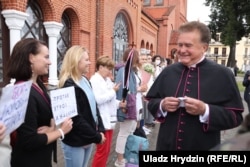 На следующий день женщины Минска создали цепь солидарности вокруг костела. Ксендз Владислав Завальнюк вышел их поприветствовать.