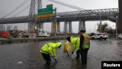 В Нью-Йорке из-за проливных дождей возникло наводнение. Улицы затоплены, не работает транспорт. По словам метеорологов, в пятницу за несколько часов выпала месячная норма осадков. Власти города объявили режим чрезвычайной ситуации.